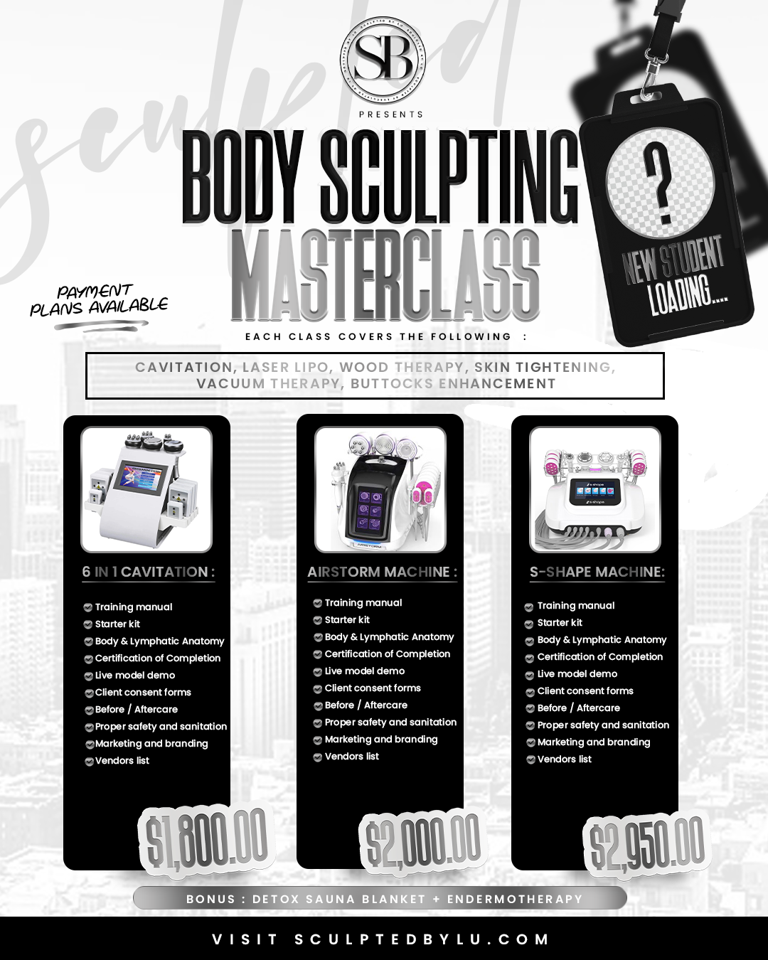 Become a body sculpting expert with our 6 in 1 cavitation, airstorm machine, and s-shape machine masterclass. Perfect for professionals looking to expand their skillset. Attend the in-person class and learn from the industry's best. DEPOSIT IS DUE TO SECURE COURSE DATE Remaining is due the day of the course.